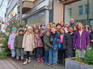 Schülerinnen und Schüler der 2. Klasse der St. Rafael Grundschule stehen stolz vor ihrem geschmückten Baum an der Kaiserstraße. Es freuen sich mit: Bürgermeister Hans-Günter Draht, Luisa Stevens vom Citymanagement und Laura Hubert von der städtischen Wirtschaftsförderung-