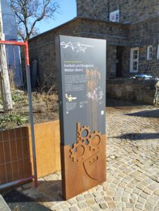 Eine der neuen Infostelen auf dem neugestalteten Gelände der Freiheit wurde mit Graffiti verunstaltet. Auch auf dem Abgang seitlich der Burgruine war der Täter aktiv. Zusätzliche Schmierereien mit Graffiti finden sich an den beiden Rastplätzen am RuhrtalRadweg. Die Stadt stellt Strafanzeige.