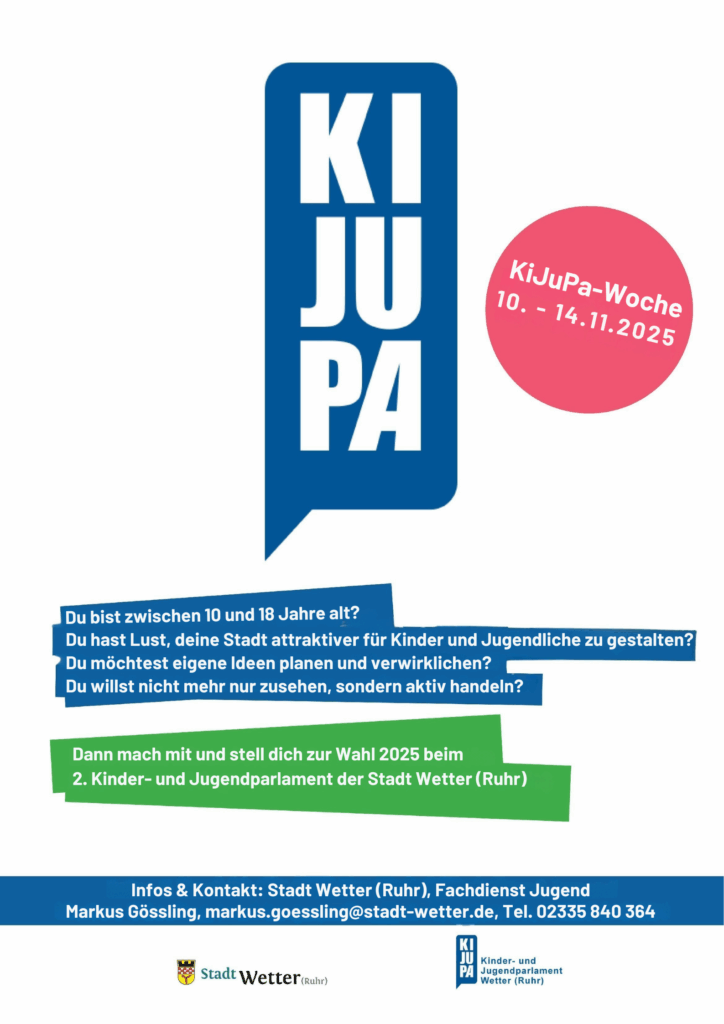Das Kinder- und Jugendparlament (KiJuPa) der Stadt Wetter (Ruhr) geht in die nächste Runde. Neben der politischen Beteiligungsmöglichkeit zu den sie betreffenden Themen, wie z. B. Freizeit oder Verkehr, können von den Kids und Teens natürlich auch eigene Aktionen und Veranstaltungen entwickelt werden. Du willst nicht mehr nur zusehen, sondern aktiv handeln? Du möchtest Deine eigenen Ideen planen und verwirklichen? Dabei ist der Kreativität keine Grenze gesetzt. Für die Umsetzung der Ideen, steht den Mitgliedern des KiJuPa ein eigenes Budget zur Verfügung. Auch Anregungen anderer Kinder und Jugendliche können mit aufgegriffen werden.